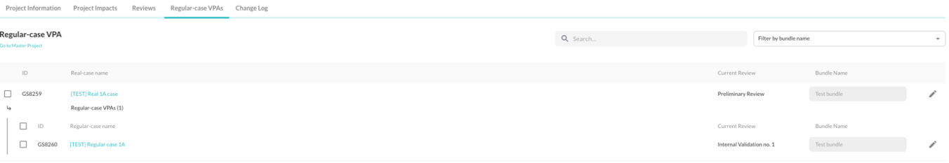 Following the structure above mentioned, a bundle named "Test bundle" was created. It contains one Real Case VPA and the only Regular Case VPA under it. It’s not possible to have two or more Real Case VPAs in the same bundle nor Regular Case VPAs from different Real Case VPAs.